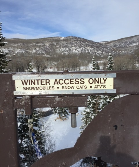 The winter restrictions sign is posted on the gate and only snow vehicles (snowmobiles, snow cats, ATVs, and the like) are permitted on BSR roads. Cars, trucks, and 4-wheel drive vehicles are not permitted until restrictions are lifted in the Spring.